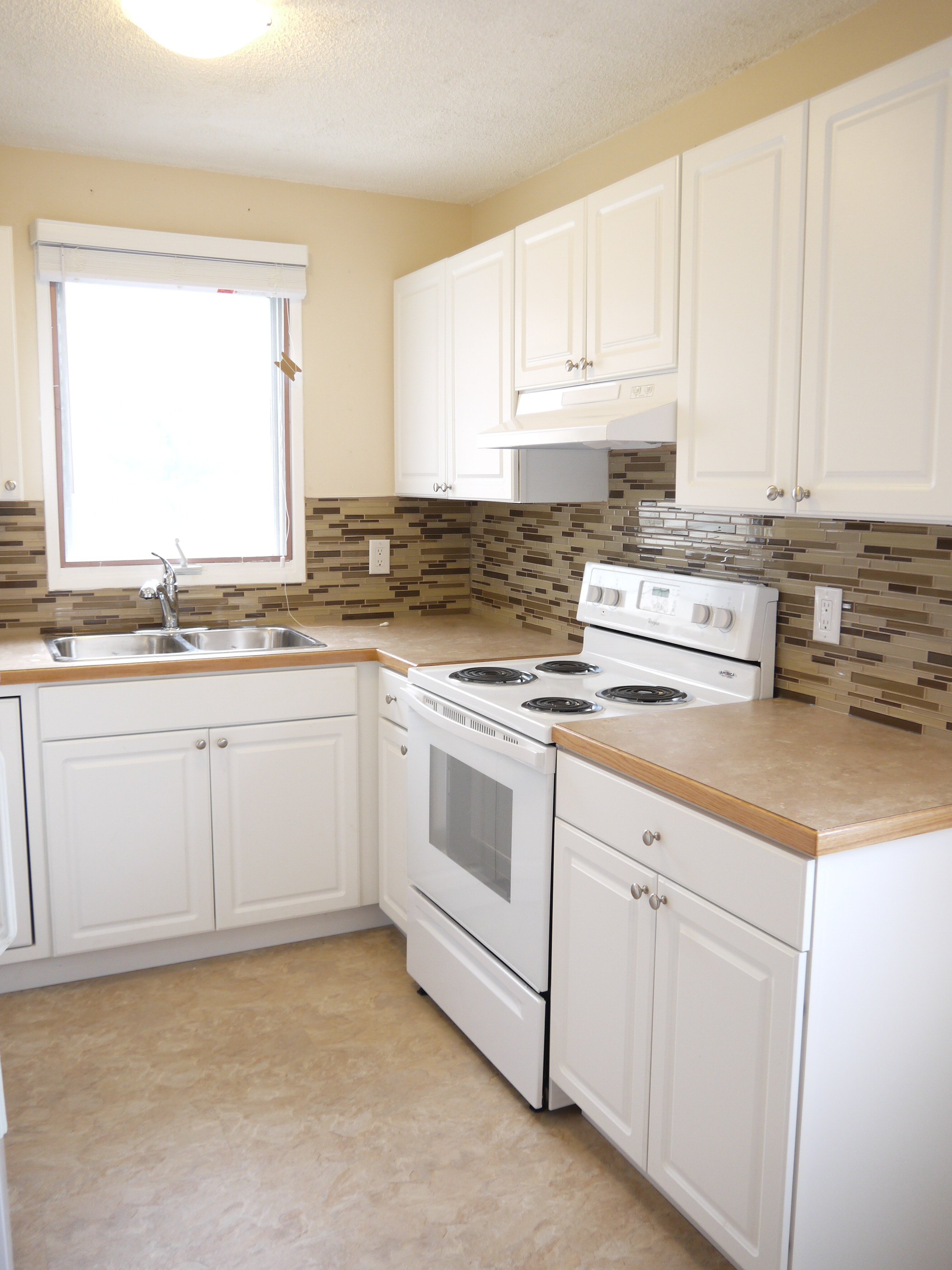 1. Recently renovated kitchen with updated cabinets, stylish countertops, backsplash, dishwasher, double sink, and pull-out faucet